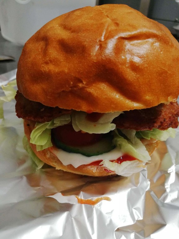hamburgerhús, jégsaláta, ketchup, lilahagyma , majonéz, mustár, paradicsom , uborka, Zöldség