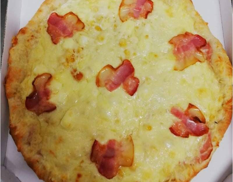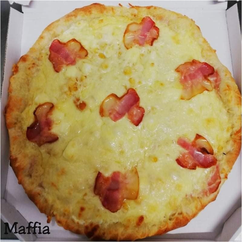 Tejfölös fokhagymás alap, Bacon, Feta sajt, Füstölt sajt, Kukorica, Sajt, Sonka